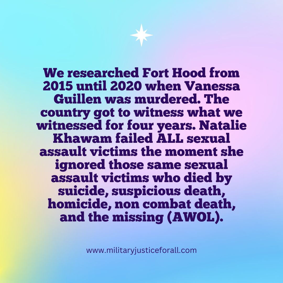 Natalie Khawam came out of nowhere and she didn’t stay in her own f*cking lane. She went to one of the Gold Star families and asked for the Guillen’s contact information. We didn’t know who she was and we didn’t think anything of it. And then we witnessed what she did to us. Not only did she run off into the sunset with the Guillen family (who had no idea of her ill intentions) but she purposefully shut down the missing and murder pattern conversation at Fort Hood and turned it into a sexual assault issue only. The only fix she cared about was sexual assault legislation that they repeated over and over to the detriment of the thousands of Gold Star families waiting for answers. The way she swooped in and preyed on the family, took over the enlisted soldier conversation (despite the fact that she is a civilian and so are the Guillens), and conveniently made the whole issue about one case when in fact what happened to Vanessa was a pattern at Fort Hood, including labeling the missing as AWOL.